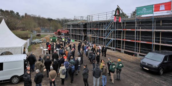 In luftiger Höhe weht der Richtkranz über dem Rohbau: Andreas Dressel (v.l.), Karen Pein und Sophie Fredenhagen lauschen dem Richtspruch von Torben Peters. Foto: Christian BittcherFeatured