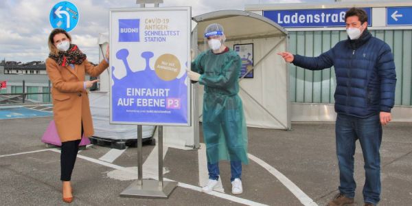 Eröffneten heute die Drive-in-Test Station auf dem Parkdeck des Phoenix-Centers: Centermanagerin Julita Hansen, Stations-Mitarbeiter Azad Kabal und Budni-Geschäftsführer Nicolas Wöhlke. Foto: Christian Bittcher