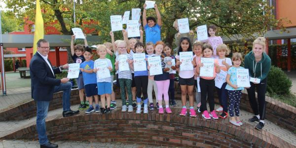 Am Ende gab es für alle Schüler eine Teilnehmer-Urkunde. Hier freut sich die 1e von Klassenlehrerin Maike Janssen. Foto: Christian Bittcher
