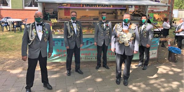 Corona nicht stattfinden. Um den Mitgliedern, Freunden und Sponsoren trotzdem Grußworte zu übermitteln, trafen sich der Vorstand und die Würdenträger am Sonnabend am Landhaus Jägerhof, um Videogrüße aufzunehmen und Festrede zu halten.