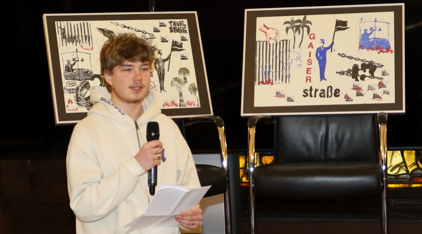 Der 17-jährige HGH-Schüler Finn Bienek erklärte den Gästen die Entstehungsgeschichte und Hintergründe zur Ausstellung. Foto: cb