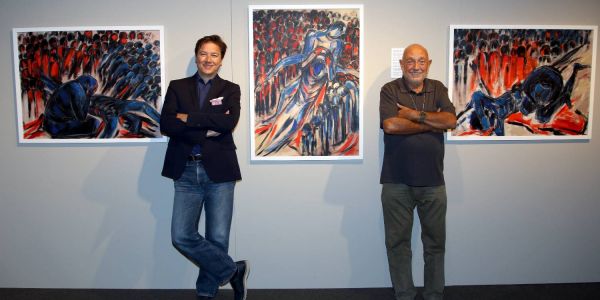Rainer-Maria Weiss und Ernst Brennecke vor dem Triptychon Gesang der Schweigenden. Foto: Christian Bittcher