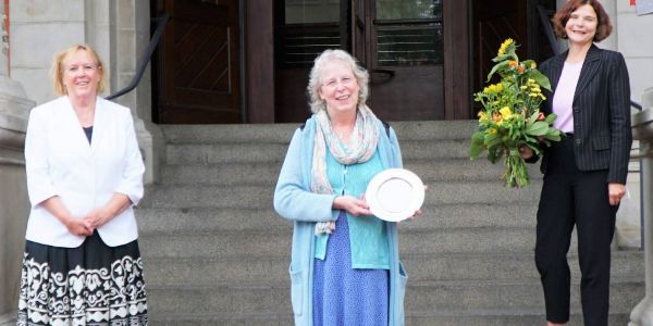 Vor dem Rathaus: Dr. Regina Marek (stellv. Vorsitzende der Bezirksversammlung), Susanne Lindenlaub-Borck, Sophie Fredenhagen (Bezirksamtsleitung). Foto: Bezirksamt Harburg