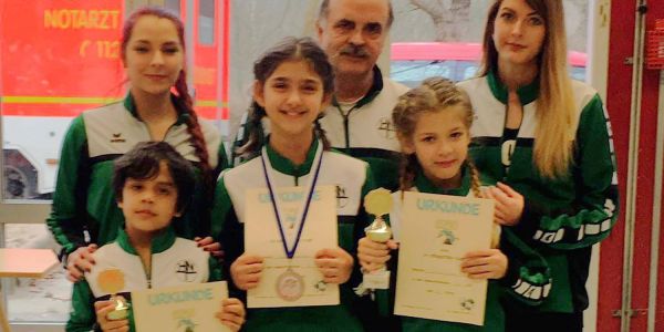Die drei erfolgreichen HNT-KämpferInnen (v.li.): Brian, Fenja und Briana. Dahinter die Trainer (v.li.) Britta Kröger, Michael Zart und Belinda Kröger. Foto: HNT
