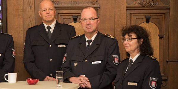 Der Chef der Schutzpolizei, Hartmut Dudde (mitte) mit Birgist Rebuschat, Personalchefin der Hamburger Polizei und Neugrabens Revierführer Thomas Preßler. Foto: André Zand-Vakili