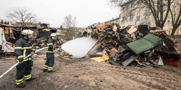 Feuerwehr löschen Möbel ab, die zu einem Haufen aufgeschichtet wurden. Foto: André Zand-Vakili