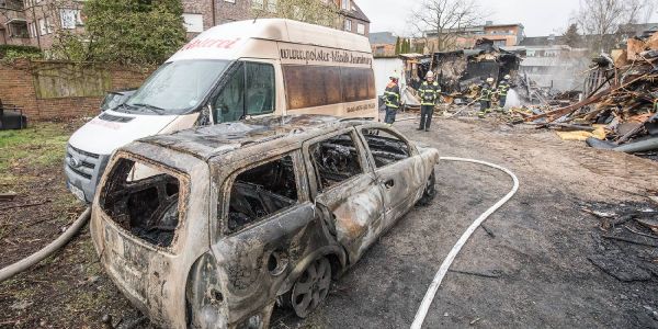 Das ausgebrannte Auto und ein beschädigter Transporter auf dem Hinterhof. Foto: André Zand-Vakili