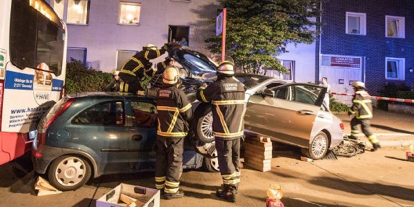 Der Unfall ereignete sich gegen 20:30 Uhr. Anwohner berichteten von einem lauten Krachen. Als sie auf die Straße kamen, standen sie einem Mercedes gegenüber, der auf dem Opel stand. Die Insassen, zunächst hieß es drei junge Frauen, später ein junger Mann und eine Frau, sowie der Fahrer (38) des Mercedes erlitten Verletzungen. Alle kamen mit Rettungswagen in umliegende Krankenhäuser. Lebensgefahr besteht für sie nicht. Sechs Fahrgäste aus dem Bus blieben unverletzt. Die Busfahrerin erlitt einen leichten Schock.