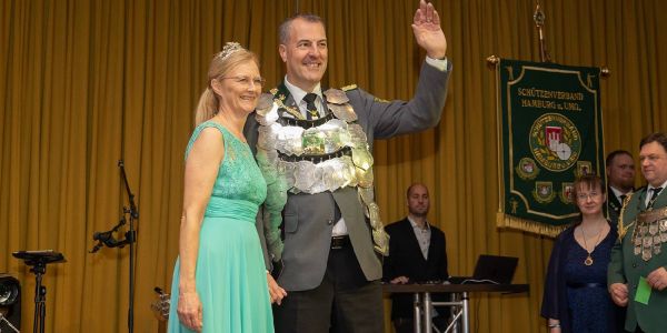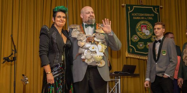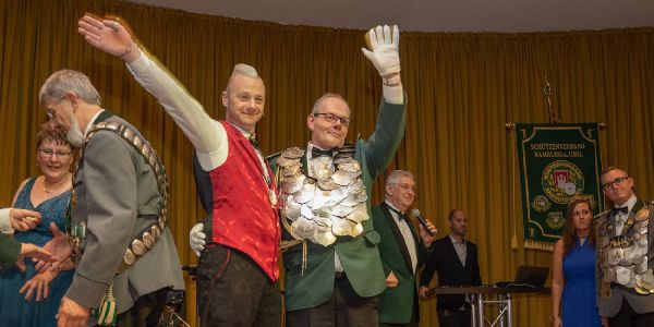 Erster Höhepunkt: Der Einmarsch der Könige, bei denen die Majestäten ihre Königsketten trugen. Die sind in der Regel zahlreiche Kilos schwer und aus Silber. Eine der Hingucker-Ketten ist die Königskette der Harburger Schützengilde von 1528, getragen von König Borhen "Bo" Azzouz.