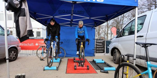 Kampf gegen die Kälte: Warmfahren vor dem Start auf der Rolle. Foto: Christian Bittcher