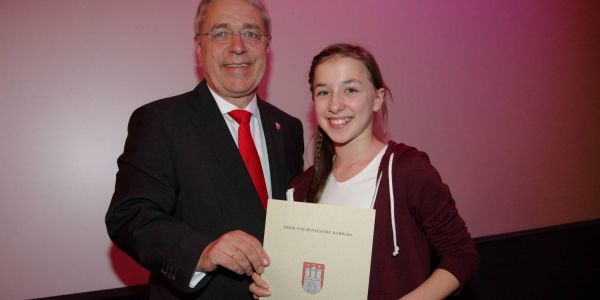 Laura Maaß vom Alexander von Humboldt-Gymnasium - hier bei der Harburger Sportlerehrung mit Bezirksamtsleiter Thomas Völsch - sicherte sich die Goldmedaille bei den Mädchen Jahrgang 2004. Foto: cb