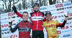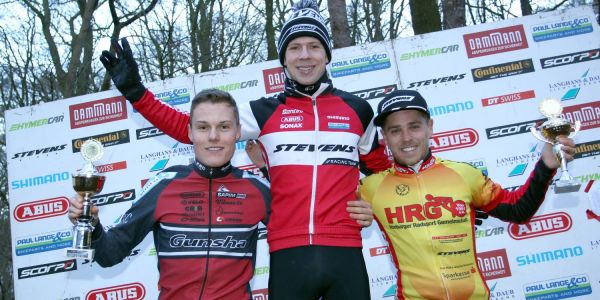 Die ersten drei des Elite-Rennens: Sieger Paul Lindenau in der Mitte. Zweiter wurde Max Möbis vom Gunsha Team. Auf dem dritten Platz kam der 27-jährige Lokalmatador Jannick Geisler (rechts). Foto: Christian Bittcher