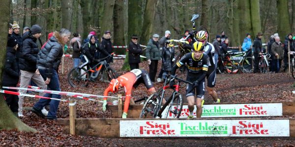 Schrecksekunde: Moritz Plambeck kommt an einem Hinderniss zu Fall und muss mit Defekt aufgeben. Foto: Christian Bittcher