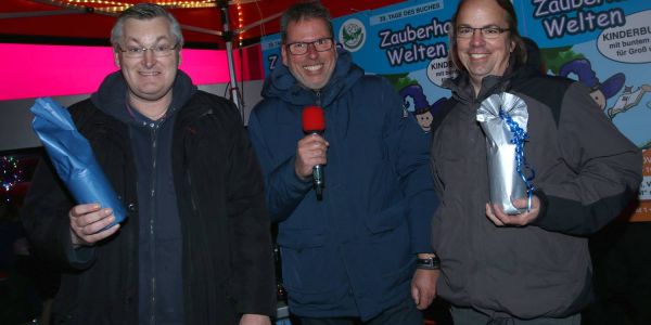 Zum Dank für das Feuerwerk gabs vom Schulleiter ein kleines Geschenk: Oliver Graetzer (links) und Peter Luth von der Feuerwerker-Schule-Nord. Foto: Christian Bittcher