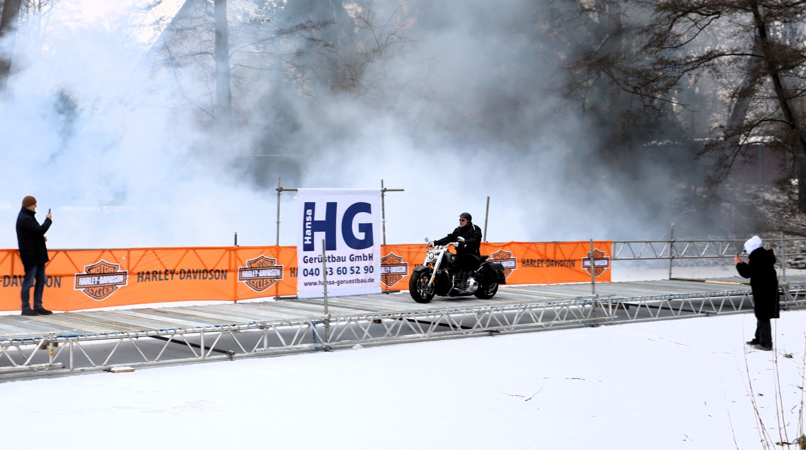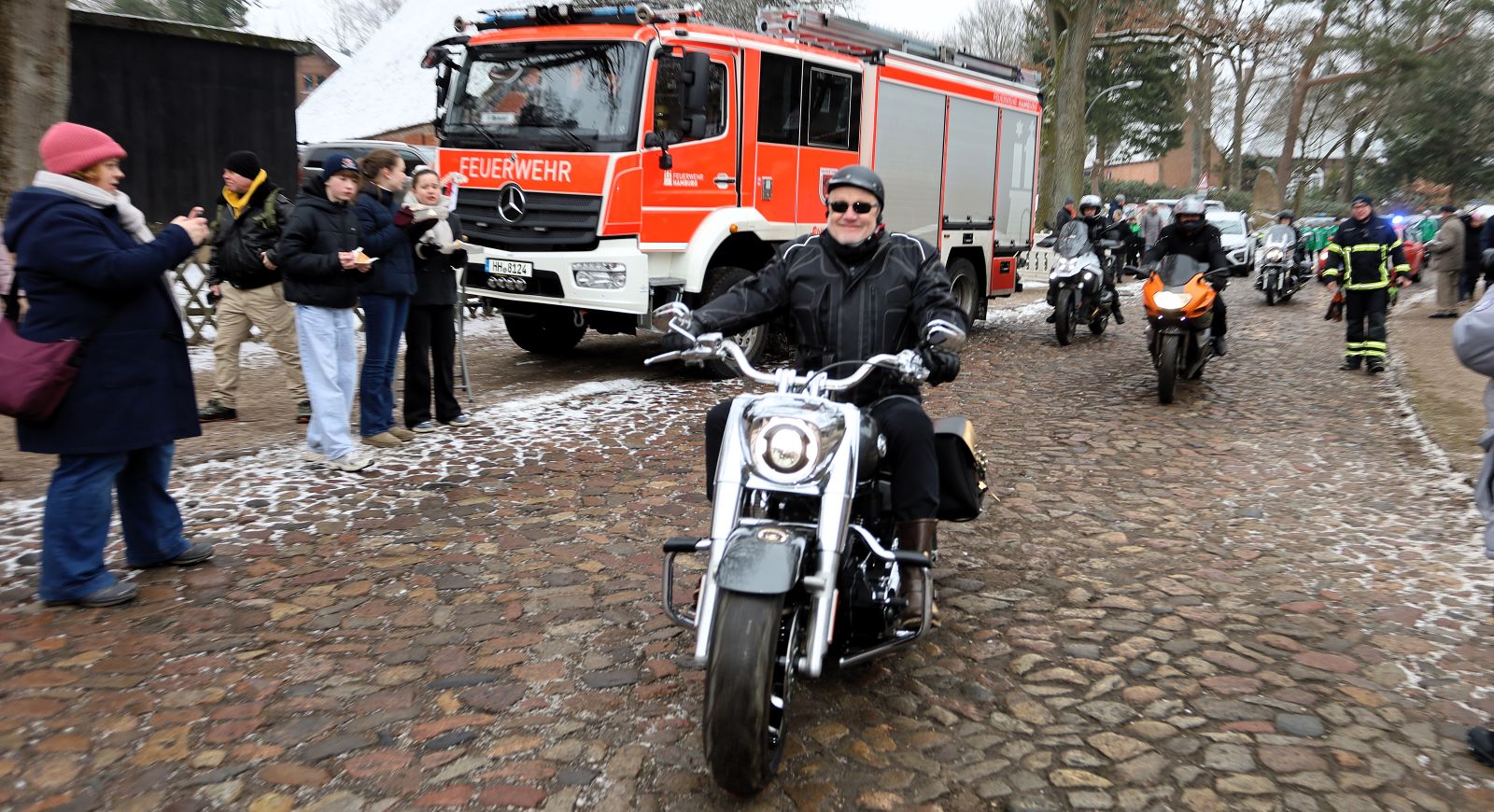 Der Schützenkönig fuhr auf einen langen Steg mit seiner Harley-Davidson „Fatboy“ über den Teich. Wettpate Thomas Helmer wurde von der Feuerwehr in einem antiken und umgebauten Pferdeschlitten gezogen.