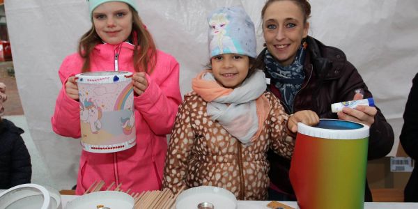 Laterne-Basteln beim Citymnanagement: Marina (11, von links) und Jasmin (7) batelten mit Nadine Senkpiel Laternen für den großen Umzug. Foto: Bittcher
