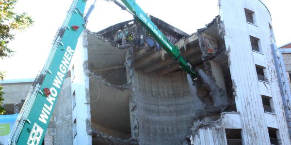 Die roten Klinker wurden an der Fassade in Höhe Schüttstraße, Ecke Harburger Ring schon für den Abriss entfernt. Auch aus dem Inneren des Gebäudes ist ohrenbetäubender Lärm zu hören. Mit einem Bohrmeißel wurde damit begonnen, die Stahlbetondecken der oberen Etage des Parkhauses zu pulverisieren. Der Abriss des Gebäudes soll etwa vier bis fünf Monate dauern. (cb)