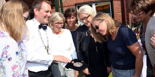 Und diese Damen waren die allerersten, die das neue Königsschild von Jörg Geffke in Augenschein nehmen durften, bevor es am Abend beim Königsessen präsentiert wird. Nach einer gemütlichen Runde bei Kaffee und Tortenspezialitäten wurde später am Abend zünftig gegrillt. Außer Steaks und Lamm vom Grill wurden Spezialitäten aus der Heimat der Königin serviert - sie stammt nämlich ursprünglich aus Bad Salzdetfurth in Niedersachsen. (cb)