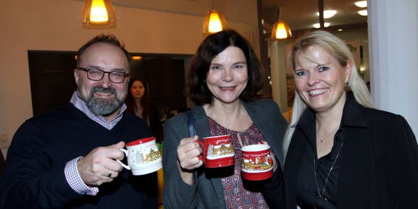 Louisa Knipschild (links) versorgt Rechtsanwalt Ingolf F. Kropp (SchlarmannvonGeyso) und Uta Rade vom Harburger Wirtschaftsverein mit Glühwein. Foto: Christian Bittcher