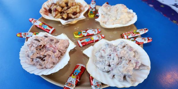 Nicht fehlen darf der klassische „Weihnachtssalat“ mit Rumrosinen, Mandarinen, Apfelspalten, Lebkuchengewürz und Shrimps. Neu im Programm ist die „Winterpflaume“, ein von Anuschka Blockhaus selbst eingelegter Kräuter-Hering, ab gerundet mit Pflaume Zimt und Mandeln.