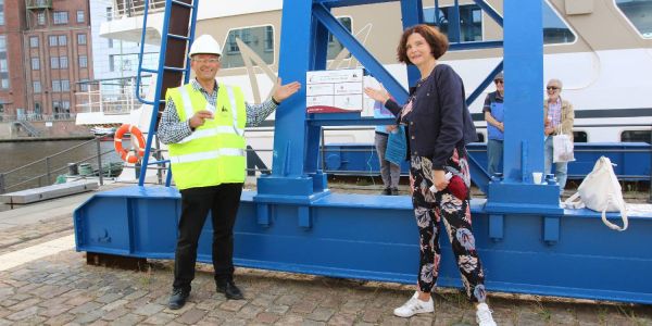 Bezirksamtsleiterein Sophie Fredenhagen und Gorch von Blomberg vom Museumshafen enthüllten eine Plakette am Kran mit allen Institutionen, die dieses Projekt finanziert und möglich gemacht haben. Foto: Christian Bittcher