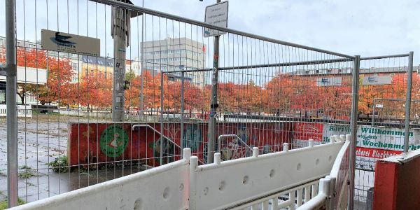 anrollen, um das Gebäude abzureißen, trotzdem wurde bereits jetzt rund um das Gebäude ein Bauzaun aufgestellt. Die Treppe vom ehemaligen Blumenmarkt auf den Sand wurde gesperrt (Foto unten). Mitarbeiter eines Abbruchunternehmens sind vor Ort, Bauschuttcontainer stehen bereit.