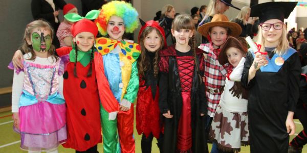 Unter dem Motto "Die Narren sind unterwegs" stand der Freutag ganz im Zeichen des Faschings, denn bereits morgens kamen die Kinder verkleidet und geschminkt als Clown, Ninja, Vampir, Prinzessin oder Fee in die Schule. Am Vormittag gab es unterschiedlichste Angebote für alle Altersgruppen. In der Zwischenzeit verwandelten Mitarbeiter der Schule die neue Sporthalle mit Girlanden, Seifenblasen-Maschine und bunten Lichtern in eine schrille Faschings-Disco.