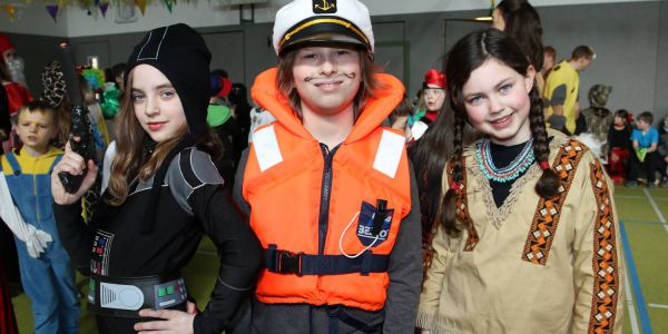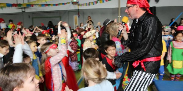 Pünktlich um 12 Uhr strömten die Klassen zur Abschluss-Party in die Sporthalle. Auf dem Programm standen Stimmungs-Hits, aufgelegt von "DJ Pirat", Andreas Wiedemann. Auch der Schulleiter und das Personal mischten beim Fasching kräftig mit und schlüpften ebenso wie die Kids in bunte Kostüme.