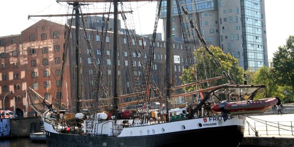 Der 52 Meter lange Großtoppsegelschoner "Fridtjof Nansen" vor der Kulisse der historischen Speichergebäude im Binnenhafen. Foto: Bittcher
