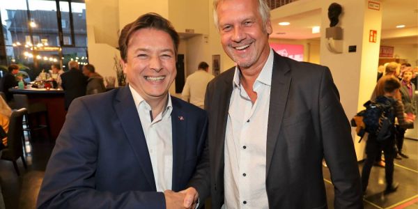 Harburgs Handelshof-Chef Jörn Sörensen wird von Rainer-Maria Weiss bei der Premiere begrüßt. Foto: Christian Bittcher