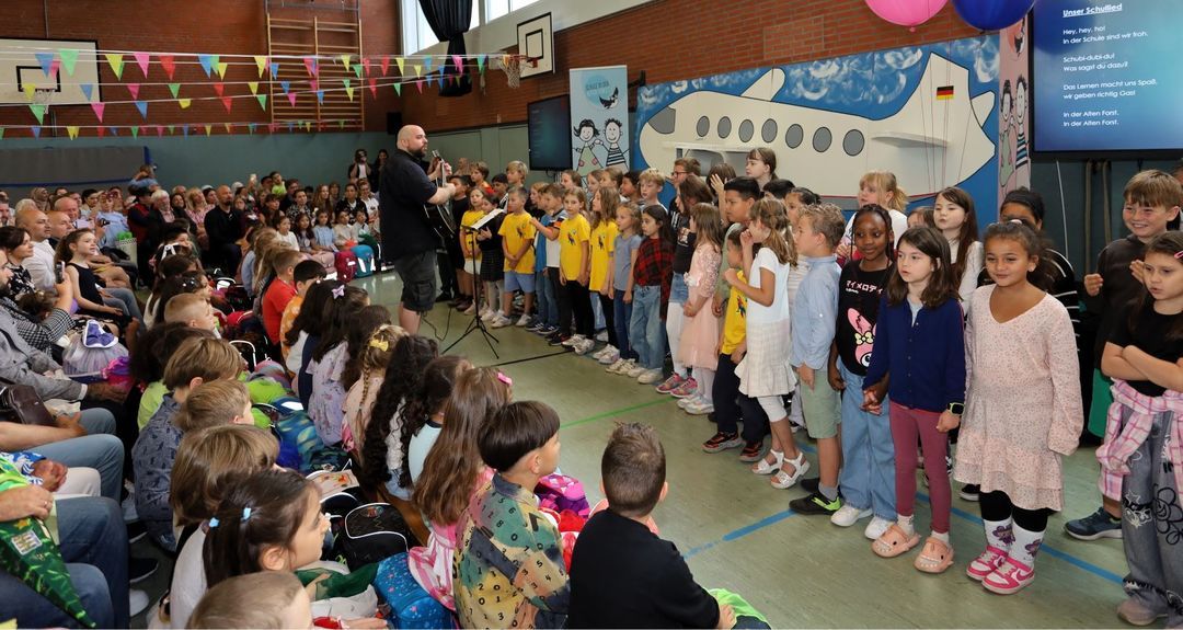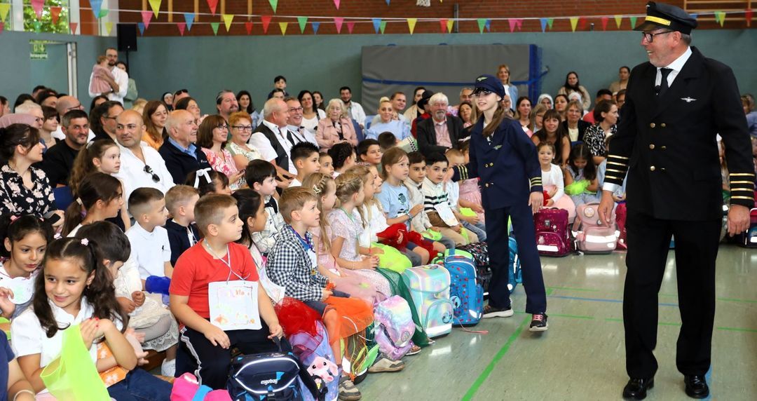 Für die 134 Erstklässler und ihre Familien gab es an der Alten Forst einen besonderen Festtag, der es in sich hatte: Die Sporthalle wurde zum Abfertigungsbereich eines Flughafens umgebaut, die Erstklässler warten auf ihren First-Class-Flug und vorher unterhielten Flugkapitän Andreas Wiedemann und seine Bord-Crew die Gäste mit jeder Menge Action, kernigen Mitmach-Aktionen und viel Rauch um nichts. Die Unterstützung des Kapitäns übernahm dabei die erst 9 Jahre alte Co-Pilotin Helene, die wie ein alter Profi ihre Sache meisterte.