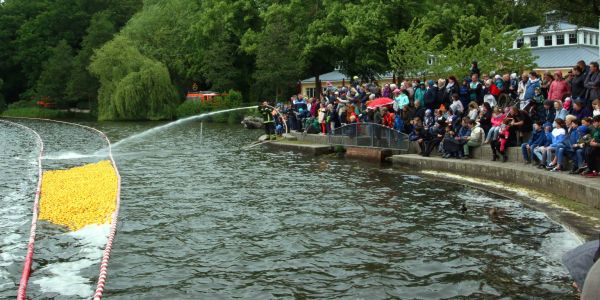 Rotary-Club Hamburg-Harburg sein beliebtes Entenrennen. Trotz leichtem Nieselregen und ungemütlichem Wind versammelten sich knapp 2000 Besucher am Ufer, um bei diesem Spektakel dabei zu sein.