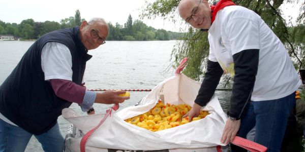 Zieleinlauf nach 150 Metern: Rotarier Thorsten Hamel holt die Platzierten Enten aus dem Wasser. Foto: Christian Bittcher