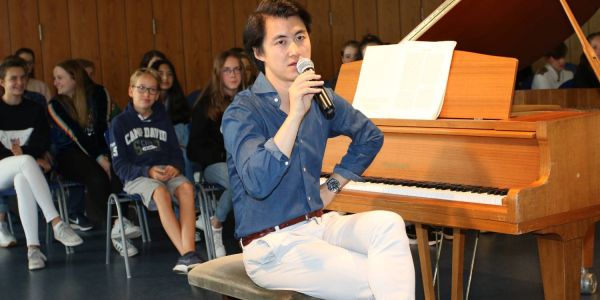 Ein weiteres Geschenk machte die Sparkasse vier Schulen an den vier Sparkassen-Standorten: Bevor Haiou Zhang abends die Erwachsenen in die Welt der Klassik entführte, besuchte er am Vormittag vier Schulen, um auch die jungen Menschen an die Klassik heranzuführen.