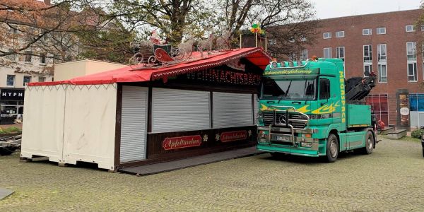 Damit zum Start alles rechtzeitig fertig ist, herrschte am Wochenende emsiges Treiben vor dem Harburger Rathaus: Die ersten Buden und das Kinderkarussell wurden bereits aufgebaut. Auch die große Weihnachtsbäckerei (Foto unten), wo in wenigen Tagen Schmalzkuchen, Apfeltaschen und andere süße Leckereien angeboten werden, steht bereits.