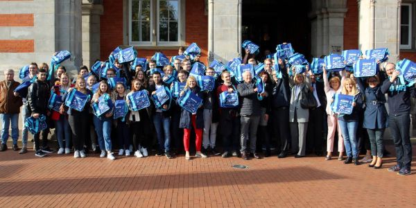Sponsoren und Organisatoren freuen sich mit den Ersties über die 10. Auflage der TUHH-Taschen. Foto: Christian Bittcher