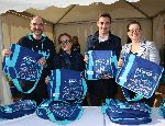 Bezirksamtsleiterin Sophie Fredenhagen übergibt Karthik Lokesh (24) aus Indien seine Tasche. Valbone Scharfenberg (Marktkauf), Malte Hilbing (Phoenix-Center) und Melanie Wittka (Harburg Arcaden) freuen sich. Foto: Christian Bittcher