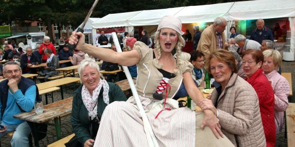 Bäuerin Greta alias Bettina Eichblatt trieb Schabernack mit den Gästen auf den Rathausplatz. Foto: Bittcher