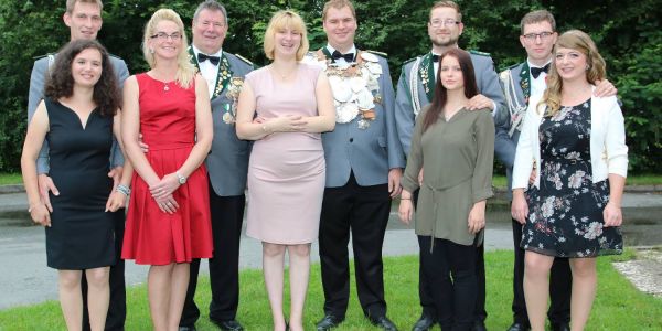Die Adjutantenpaare nehmen das junge Königspaar Jan und Ricarda Kruse in ihre Goldene Mitte. Foto: Christian Bittcher