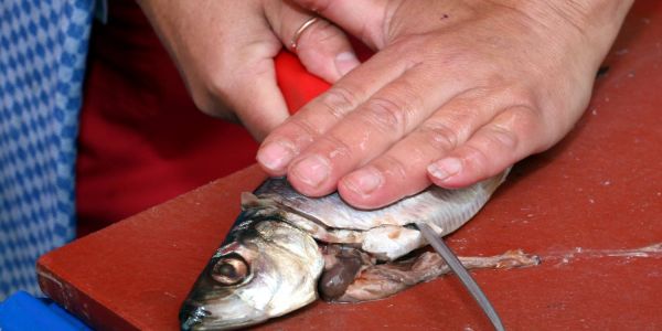 Mit einem scharfen Messer wird der Fisch zunächst halbiert. Foto: Christian Bittcher
