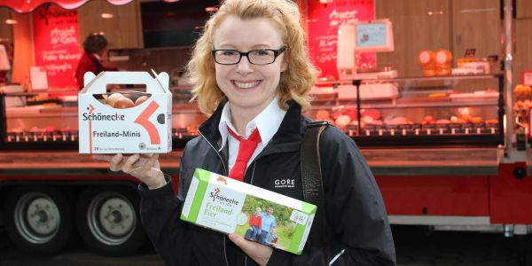 Hier ist bei Schönecke Handarbeit von geschultem Personal Realität, wo andere bereits Computer die Eier prüfen lassen. Nur qualitativ einwandfreie Eier kommen in die Schachtel. Dann werden die Eier in 4er, 6er- und 10er-Schachteln oder auf 30er Pappen verpackt. Beliebt sind die kleinen Körbe mit 20 Freiland-Minis. Sie werden tatsächlich von Hand befüllt.
