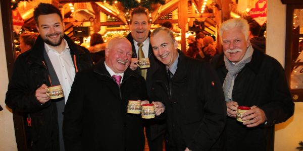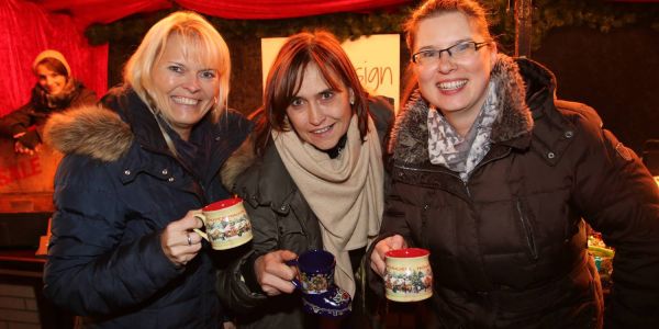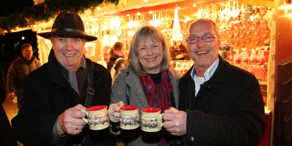 Jürgen Heimath (SPD), Uta Rade (Wirtschaftsverein) und Bezirkshandwerksmeister Peter Henning lassen sich den Glühwein schmecken. Foto: cb