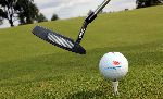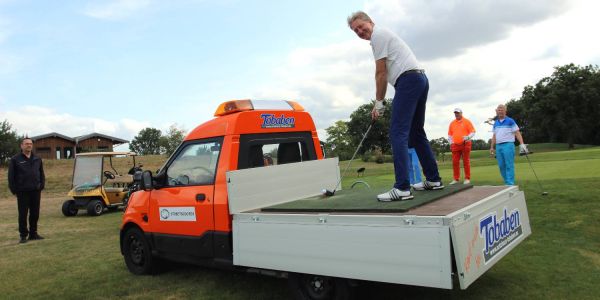 Abschlag von der Ladefläche eines E-Transporters vom Autohaus Tobaben: Frank Brockmann (stellvertretender Vorstandssprecher der Haspa) in Aktion. Foto: Christian Bittcher