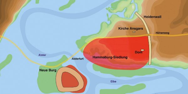 Der Heidenwall riegelte ab dem 11. Jahrhundert das Siedlungsgebiet von der Alster im Norden bis zur Elbe im Süden gegen Feinde ab. Die gewaltige Neue Burg liegt im Westen der Stadt, jenseits der Alster. Foto: Archäologisches Museum Hamburg