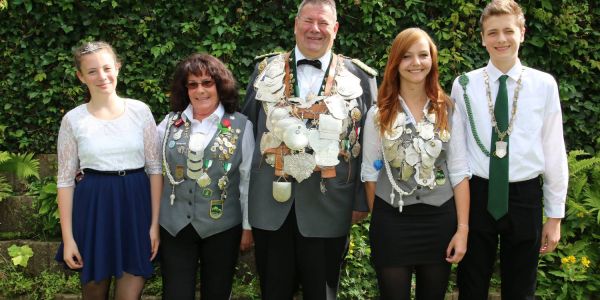 Die Würdenträger des SV Heimfeld: Rieke Kabuse (v.l. Kinderkönigin), Ingrid Matthies (Vize-König), Jens Kabuse, Vanessa Thermer (Jungschützenkönigin)und Marvin Klensang (Jungschützen-Vizekönig). Foto: cb