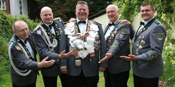 Die Adjutanten Klaus Bergmann (v.l.), Stephan Klensang Sven Heinsohn und Martin Dutschmann nehmen ihren König in die Mitte. Foto: cb