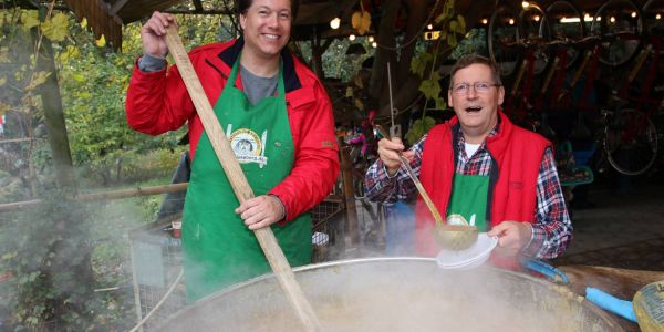 Ein echter Klassiker auf dem Hubertusmarkt: Thomas Kipcke (links) und Volker Schröder mit der dampfenden Erbsensuppe. Foto: cb