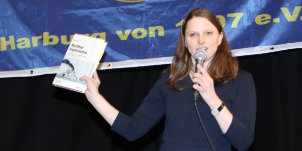 Der Auftritt in der Fischhalle war ein echtes Heimspiel für die Senatorin: Die meisten der Anwesenden kannte sie persönlich sorgte mit ihrer lockeren und sympathischen Art für eine angenehme Atmosphäre. Der Titel ihres "Jubiläumsgeschenks": "Flottenbau und Marinebegeisterung - Kritik in Politik und Gesellschaft in Deutschland“.