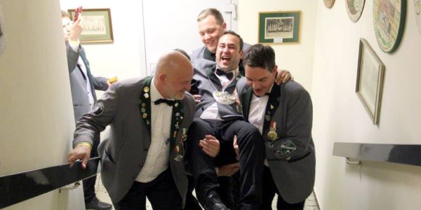 Der Moment nach dem Königsschuss: Der frisch gebackene König Borhen Azzouz wird von den Kameraden Guido Mönke, Dominik Mönke und Carsten Exner aus dem Schießstand getragen. Foto: Mönke