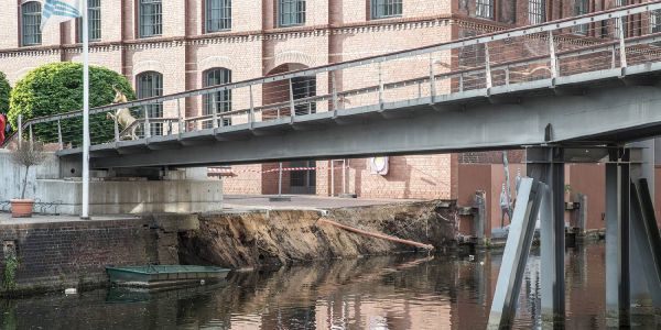 Harburg - Der Binnenhafen bröckelt. Am westlichen Bahnhofskanal, zwischen der Fußgängerbrücke und dem Palmspeicher, ist auf mehreren Metern die Kaimauer weggebrochen.